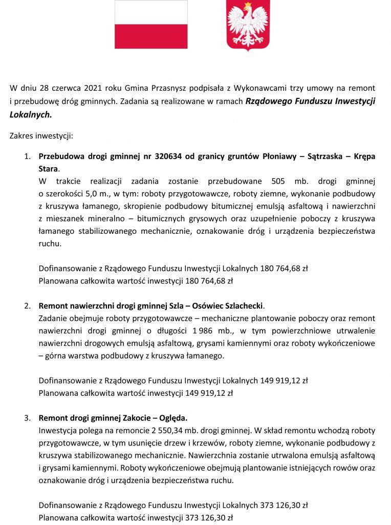 W dniu 28 czerwca 2021 roku Gmina Przasnysz podpisała z Wykonawcami trzy umowy na remont i przebudowę dróg gminnych. Zadania są realizowane w ramach Rządowego Funduszu Inwestycji Lokalnych. Dzięki temu mieszkańcy zyskają lepszy dostęp do swoich miejscowości.