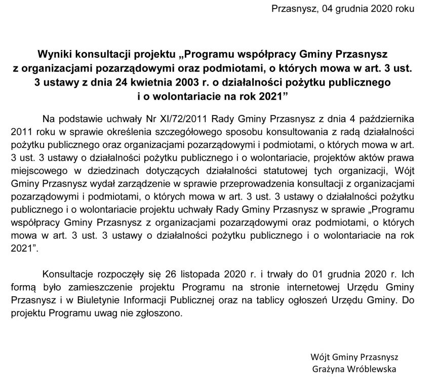 Przedstawiamy informację na temat przeprowadzonych konsultacji programu współpracy z organizacjami pozarządowymi z terenu gminy Przasnysz na rok 2021.