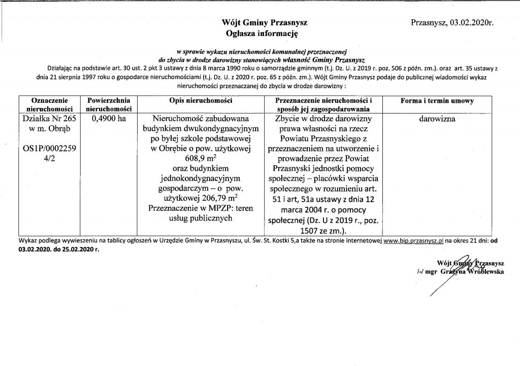 Wójt Gminy Przasnysz informuje o nieruchomości na terenie wsi Obrąb stanowiącej własność Gminy Przasnysz możliwej do przekazania w drodze darowizny.