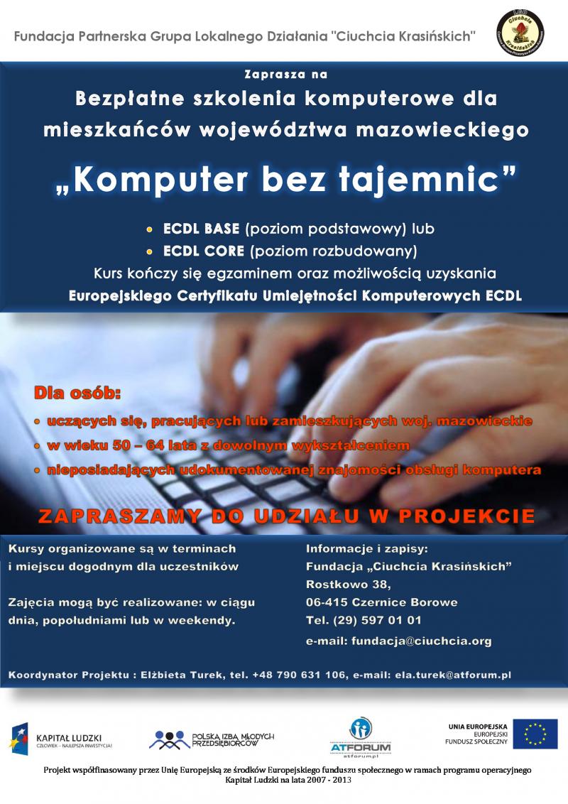 Lokalna Grupa Działania "Ciuchcia Krasińskich" zaprasza wszystkich mieszkańców Mazowsza na bezpłatne szkolenia komputerowe, które mają podnieść poziom kompetencji w zakresie edukacji cyfrowej. Kursy kończą się uzyskaniem Europejskiego Certyfikatu Umiejętności Komputerowych.