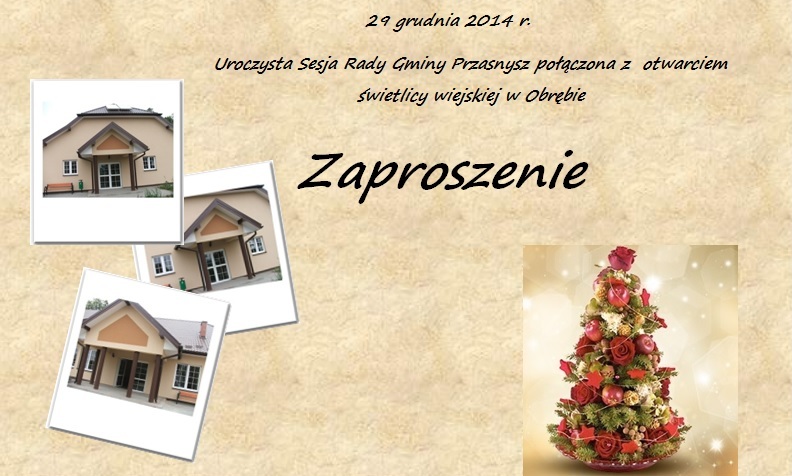 29 grudnia w Obrębie odbędzie się ostatnia w tym roku sesja Rady Gminy Przasnysz, połączona z uroczystością oddania do użytku tutejszej świetlicy wiejskiej wyremontowanej dzięki środkom unijnym. Na sesję zapraszają: Wójt Gminy Przasnysz, Przewodniczący Rady Gminy Przasnysz, Koło Gospodyń Wiejskich w Obrębie, a także Ochotnicza Straż Pożarna w Obrębie.