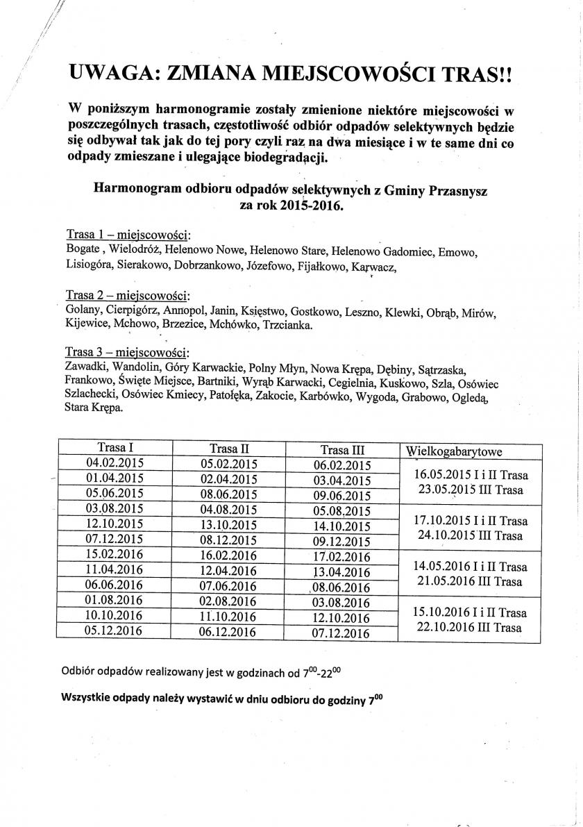 Poniżej przedstawiamy nowy przebieg tras odbioru odpadów selektywnych. Bardzo prosimy wszystkich mieszkańców gminy Przasnysz, którzy zdecydowali się na segregowanie śmieci, by sprawdzili, czy ich trasa nie została zmieniona. Mieszkańcy tych miejscowości, które znalazły się z innych trasach niż dotychczas, będą mieli zmienione terminy odbioru posegregowanych odpadów.
