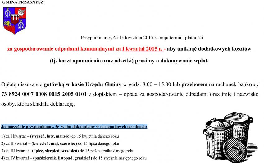 Urząd Gminy Przasnysz przypomina wszystkim mieszkańcom gminy o zbliżającym się terminie opłat za odbiór odpadów komunalnych z terenu gospodarstw indywidualnych za I kwartał 2015 roku. Termin ten upływa 15 kwietnia.