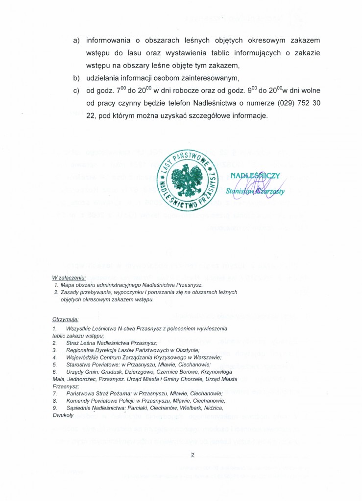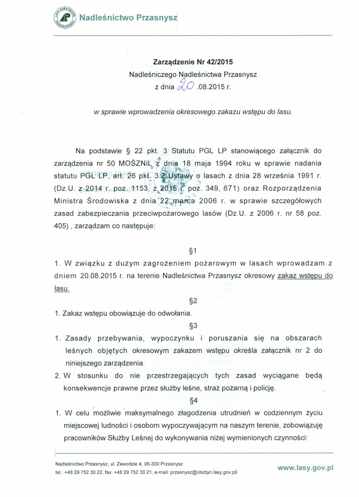Z dniem 20 sierpnia Nadleśnictwo Przasnysz wprowadziło okresowy zakaz wstępu do lasów administrowanych przez tę instytucję. Oznacza to, że lasy z całego terenu gminy Przasnysz stanowiące własność Lasów Państwowych są zamknięte dla osób postronnych. Poruszanie się po tym terenie jest możliwe tylko wyznaczonymi drogami, ścieżkami pieszymi lub rowerowymi.