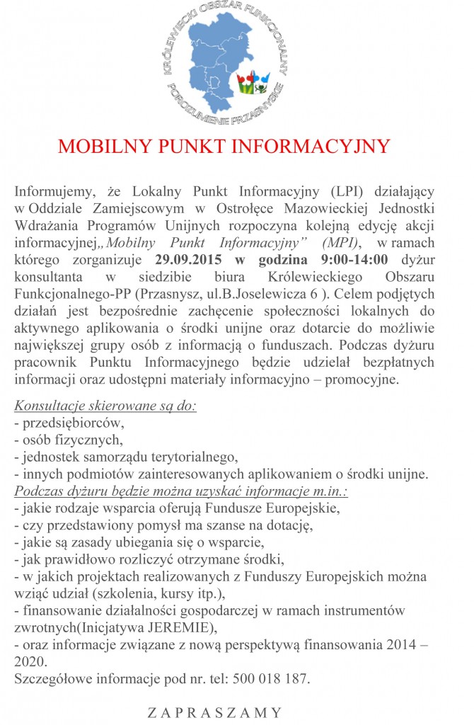 We wtorek, 29 września, w przasnyskim biurze Królewieckiego Obszaru Funkcjonalnego dyżurować będzie przedstawiciel Mazowieckiej Jednostki Wdrażania Programów Unijnych, Oddział Zamiejscowy w Ostrołęce. Dyżur jest związany z rozpoczęciem kolejnej edycji akcji informacyjnej „Mobilny Punkt Informacyjny” (MPI), a jego celem będzie zapoznanie mieszkańców z możliwością pozyskiwania środkóów unijnych w najbliższych latach.