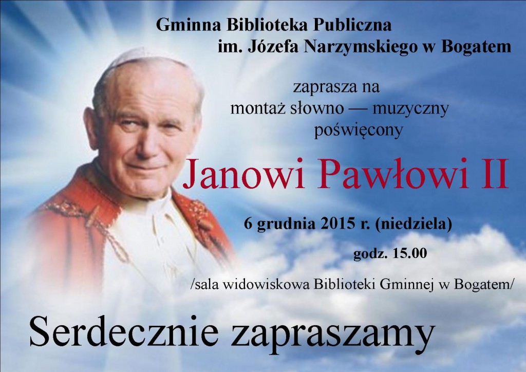 Gminna Biblioteka Publiczna im. J. Narzymskiego w Bogatem zaprasza na montaż słowno-muzyczny poświęcony postaci papieża Polaka - Jana Pawła II. Uroczystość organizowana wespół z różnymi środowiskami i grupami artystycznymi odbędzie się w niedzielę, 6 grudnia, w sali widowiskowej Biblioteki. Wstęp oczywiście bezpłatny.