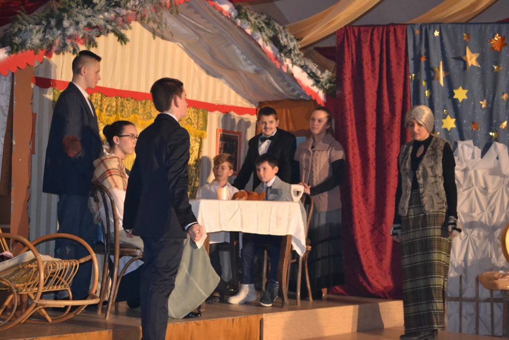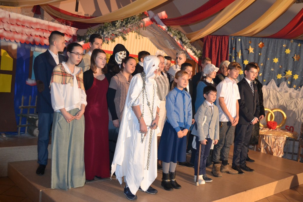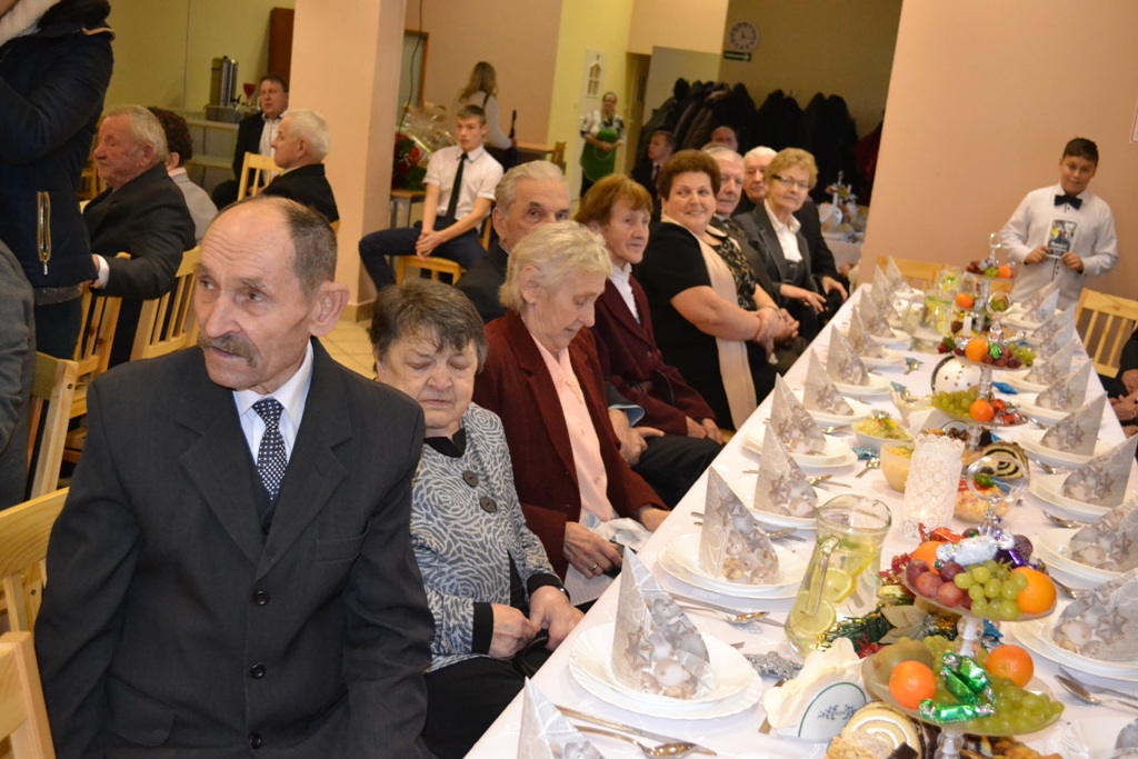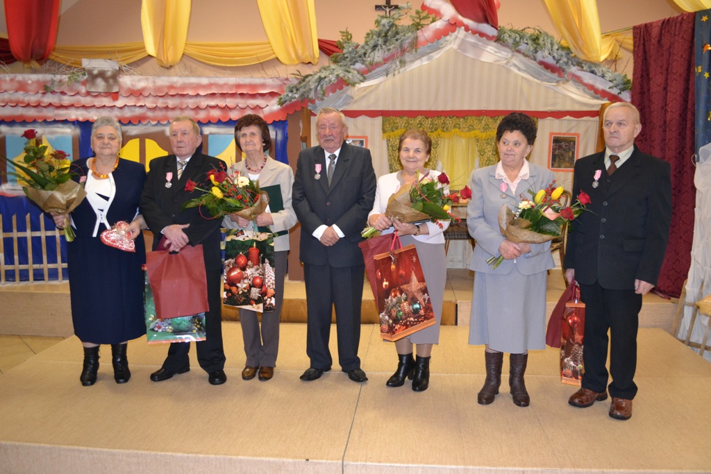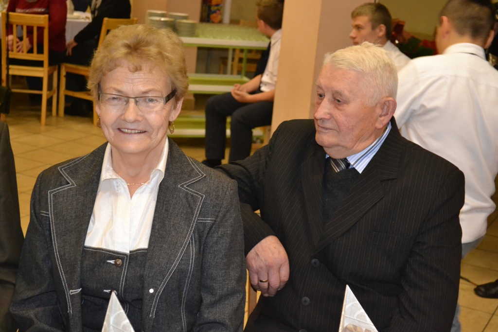 Tu wszyscy zgromadzeni najpierw uczestniczyli w ceremonii dekoracji złotych par, by później wspólnie obejrzeć spektakl „Opowieść wigilijna” przygotowany przez młodzież z Zespołu Szkół w Lesznie pod okiem katechety Bogusława Brykały. Nie zabrakło też okolicznościowego tortu, a nade wszystko – życzeń podwójnego złotego jubileuszu.