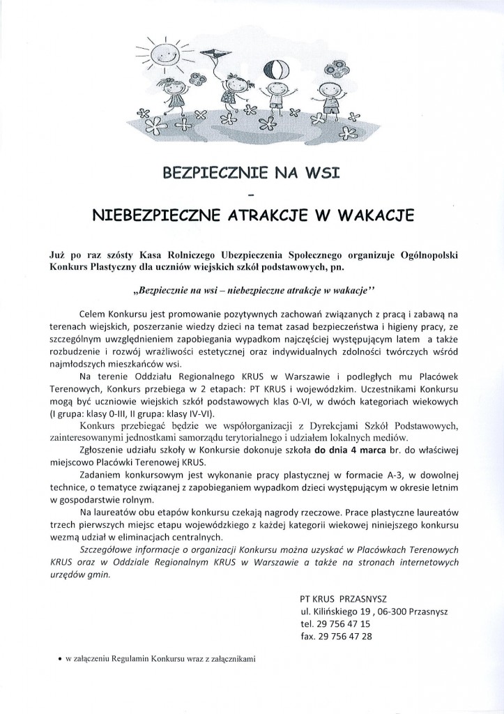 Już po raz szósty Kasa Rolniczego Ubrzpieczenia Społecznego organizuje konkurs plastyczny dla uczniów wiejskich szkół podstawowycg pt. "Bezpiecznie na wsi - niebezpieczne atrakcje w wakacje". Szkoły mają czas do 4 marca, by zgłosić chęć udziału we właściwej terytorialnie placówce KRUS.
