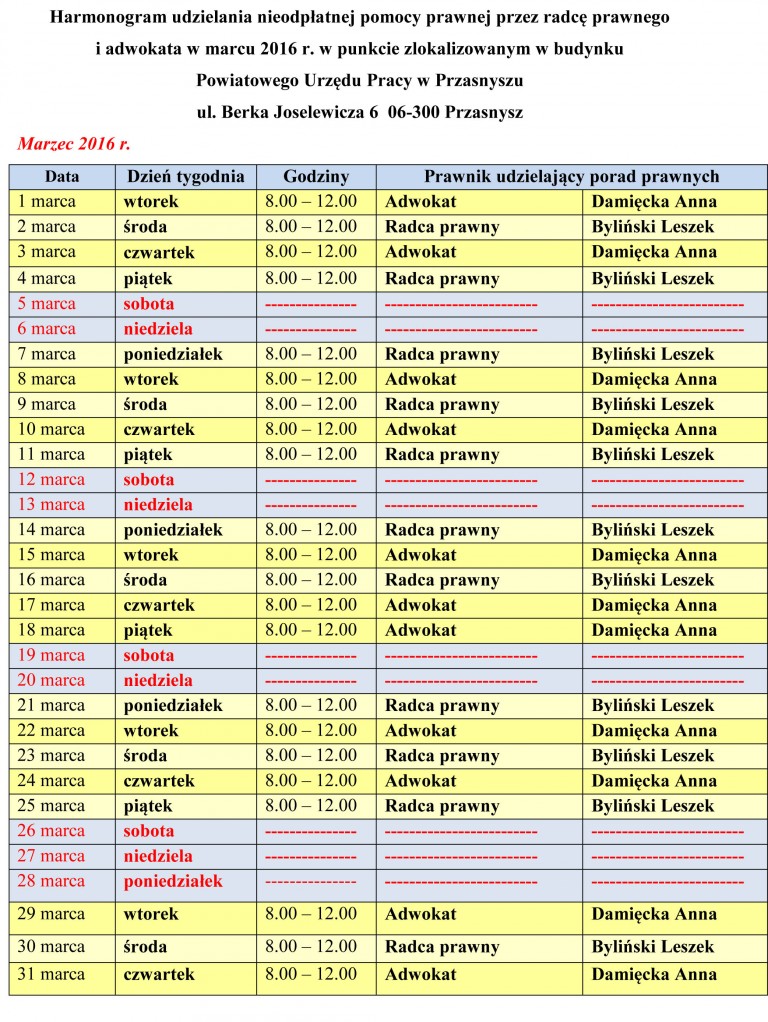Przedstawiamy marcowy grafik pracy adwokatów i radców prawnych udzielających porad w ramach systemu bezpłatnego poradnictwa prawnego dla mieszkańców Przasnysza i gminy Przasnysz. Prawnicy przyjmują w budynku Powiatowego Urzędu Pracy przy ul. Berka Joselewicza.