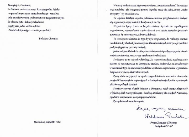 Życzenia od Prezesa Zarządu Głównego Związku Ochotniczych Straży Pożarnych RP, Waldemara Pawlaka przesłane m.in. do druhów ochotników z terenu gminy Przasnysz.