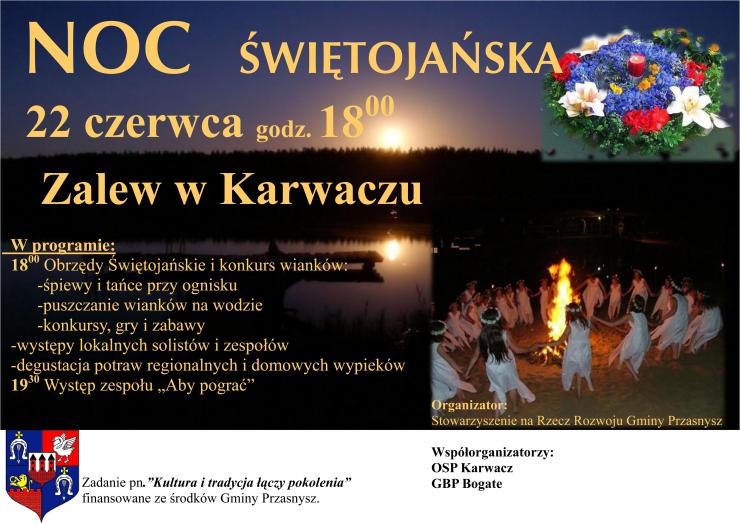 Stowarzyszenie Rozwoju na rzecz Gminy Przasnysz organizuje w najbliższą niedzielę, 22 czerwca, festyn pod nazwą "Noc Świętojańska". W związku z tym zapraszamy serdecznie na to wydarzenie wszystkich mieszkańców gminy Przasnysz oraz powiatu przasnyskiego.
