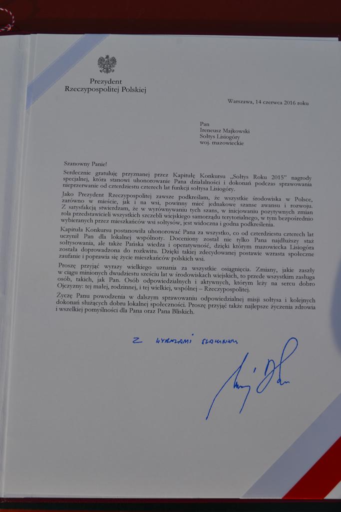 „Serdecznie gratuluję przyznanej przez Kapitułę Konkursu „Sołtys Roku 2015” nagrody specjalnej, która stanowi uhonorowanie Pana działalności i dokonań podczas sprawowania nieprzerwanie od czterdziestu czterech lat funkcji sołtysa Lisiogóry.