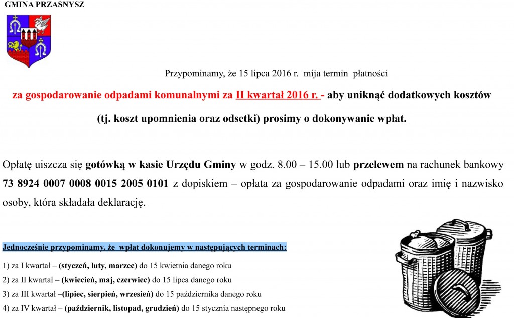 Przypominamy wszystkim mieszkańcom gminy Przasnysz, że 15 lipca 2016 roku mija termin opłaty za wywóz śmieci za II kwartał 2016 roku (od kwietnia do czerwca). W związku z tym prosimy o terminową opłatę te osoby, które jeszcze jej nie uiściły.