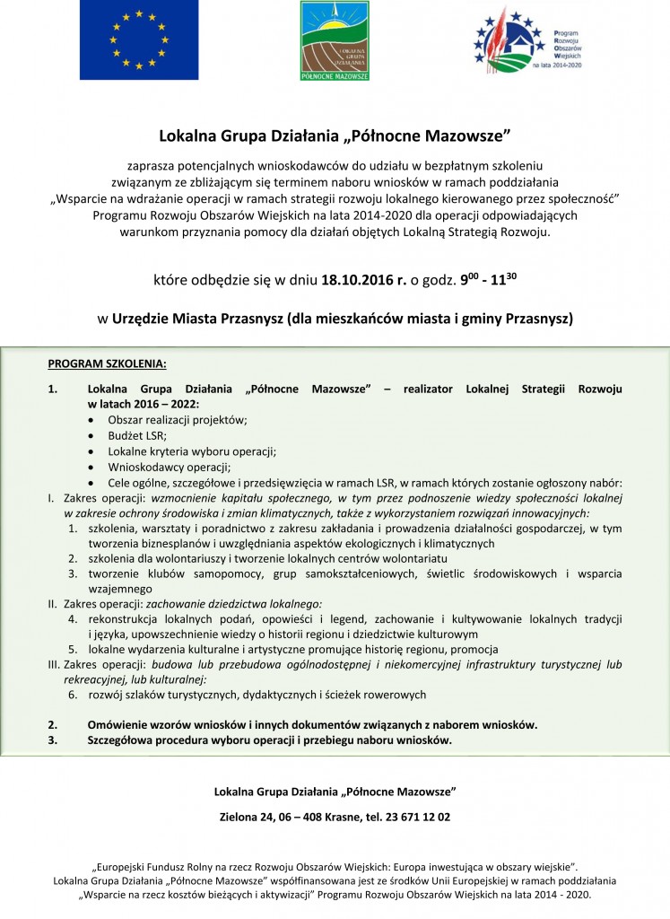 Lokalna Grupa Działania „Północne Mazowsze” zaprasza potencjalnych wnioskodawców do udziału w bezpłatnym szkoleniu które odbędzie się w dniu 18.10.2016 r. (wtorek) o godz. 9.00 – 11.30 w Urzędzie Miasta Przasnysz (dla mieszkańców miasta i gminy Przasnysz).