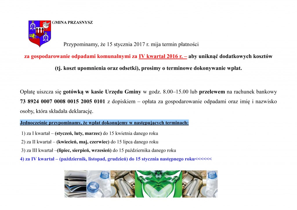 Urząd Gminy Przasnysz przypomina wszystkim mieszkańcom gminy o zbliżającym się terminie opłat za odbiór odpadów komunalnych z terenu gospodarstw indywidualnych za IV kwartał 2016 roku. Termin ten upływa 15 stycznia.