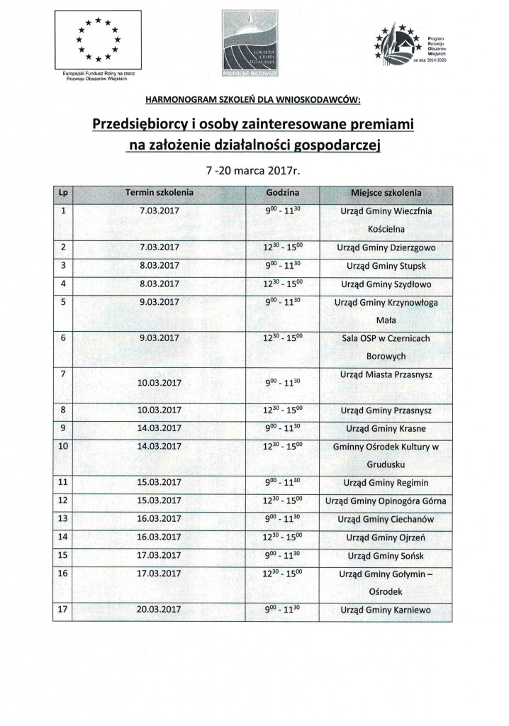 Oto proponowane daty i godziny szkoleń organizowanych przez LGD.
