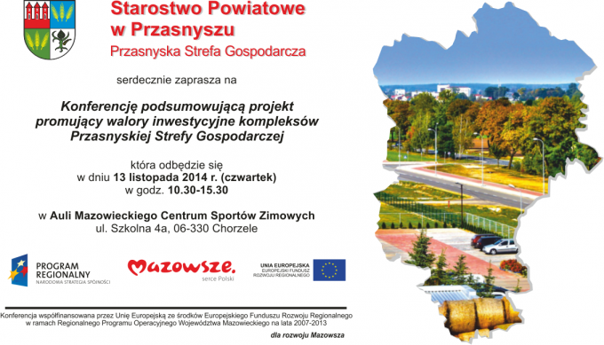Starostwo Powiatowe w Przasnyszu zaprasza wszystkich zainteresowanych na konferencję poświęconą podsumowaniu projektu promującego walory inwestycyjne kompleksu Przasnyskie Strefy Gospodarczej. Wspomniana konferencja odbędzie się w czwartek, 13 listopada, w godzinach 10.30-15.30, w auli Mazowieckiego Centrum Sportów Zimowych w Chorzelach.