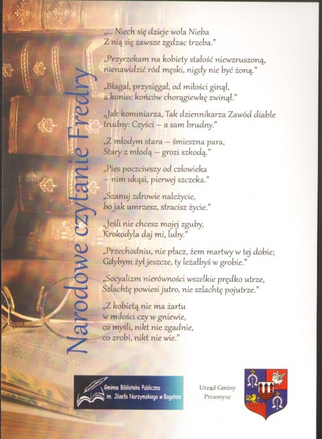 W trakcie dożynek zaprezentowano fragmenty najbardziej znanych wierszy Aleksandra Fredry – przede wszystkim tych skierowanych do dzieci. „Cygan i baba”, „Nasza Ojczyzna”, „Paweł i Gaweł”, „Żona” i „Bajeczka o osiołku” – te i inne utwory czytali m.in. pracownicy Gminnej Biblioteki Publicznej z Bogatego, a także członkowie tamtejszego Klubu Seniora.