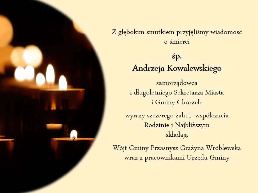 Kondolencje dla rodziny zmarłego śp. Andrzeja Kowalewskiego, długoletniego sekretarza Urzędu Miasta i Gminy w Chorzelach, od Wójt Grażyny Wróblewskiej i wszystkich pracowników Urzędu Gminy Przasnysz.