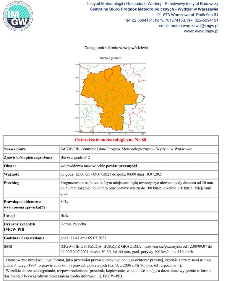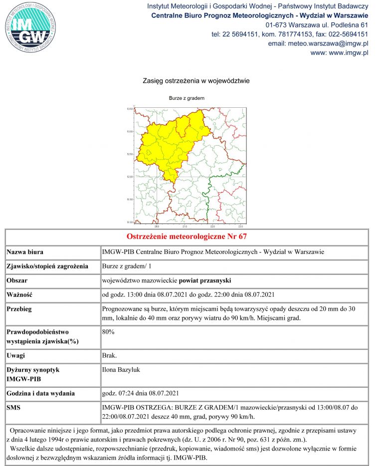 Instytut Meteorologii i Gospodarki Wodnej - Państwowy Instytut Badawczy Centralnego Biura Prognoz Meteorologicznych wydał ostrzeżenie pierwszego stopnia o burzach z gradem, które mogą wystąpić na terenie województwa mazowieckiego. Ostrzeżenie zostało wydane pierwotnie na czwartek, 8 lipca i obowiązywało do godziny 22.00. Następnie rozszerzono ostrzeżenia do nocy z piątku na sobotę, 10 lipca.