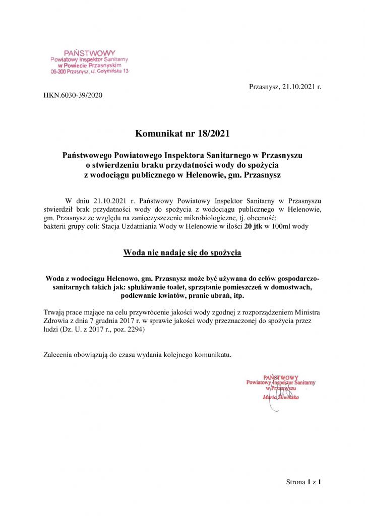 W związku z wynikami badań z czwartku, 21 października, o stwierdzeniu zanieczyszczeń mikrobiologicznych w stacji uzdatniania wody w Helenowie Nowym - zabrania się używania wody do celów spożywczych. Woda może być używana wyłącznie do celów gospodarczo-sanitarnych, tj. spłukiwania toalet, sprzątania pomieszczeń w domostwach, podlewania kwiatów, prania ubrań itp.