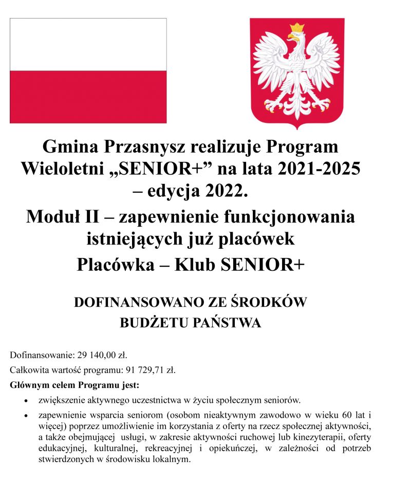 Gmina Przasnysz pozyskała ze środków budżetu państwa niemal 30 tysięcy złotych na funkcjonowanie w tym roku Klubu Seniora. Na taki cel udało się pozyskać środki z programu Klub Senior + w wysokości 29 140 zł.