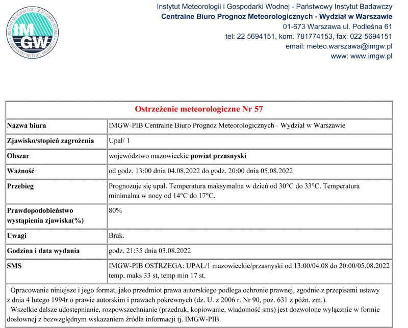 Centralne Biuro Prognoz Meteorologicznych IMGW-PIB - Wydział w Warszawie wydał komunikat z ostrzeżeniem dla województwa mazowieckeigo o trwających upałach. W związku z panującymi wysokimi temperaturami zalecane jest unikanie otwartych przestrzeni, zwłaszcza przez osoby chore i starsze. Komunikat obowiązuje do piątku, 5 sierpnia, do godz. 20.00.
