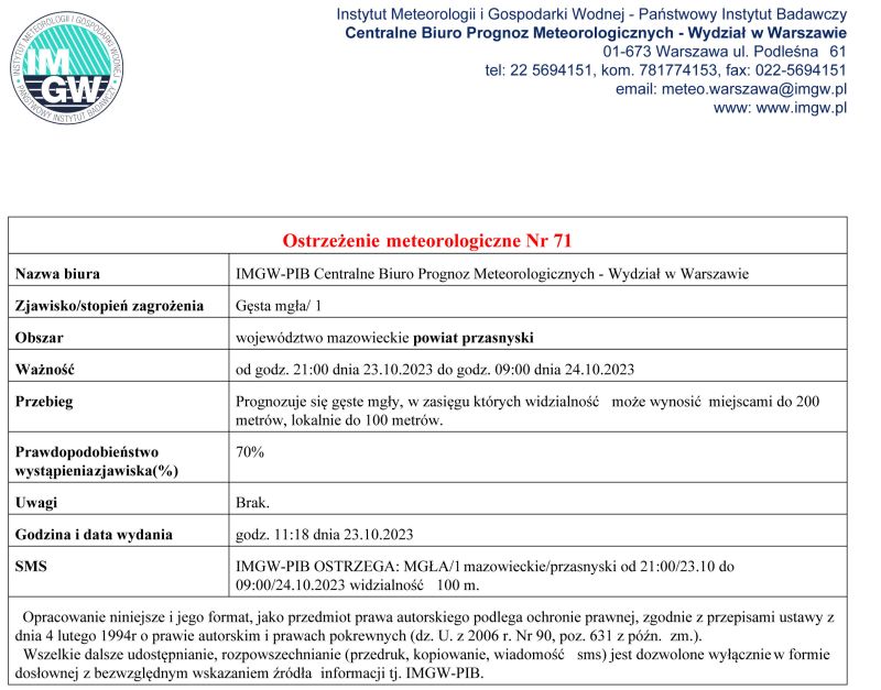Centralne Biuro Prognoz Meteorologicznych IMGW-PIB Wydział w Warszawie wydał ostrzeżenie meteo dotyczące prognozowanej mgły występującej na Mazowszu - mgła może miejscami ograniczać widzialność do 100 metrów. Ostrzeżenie obowiązuje od 23 października od godz. 21.00 do 24 października do godz. 9.00.