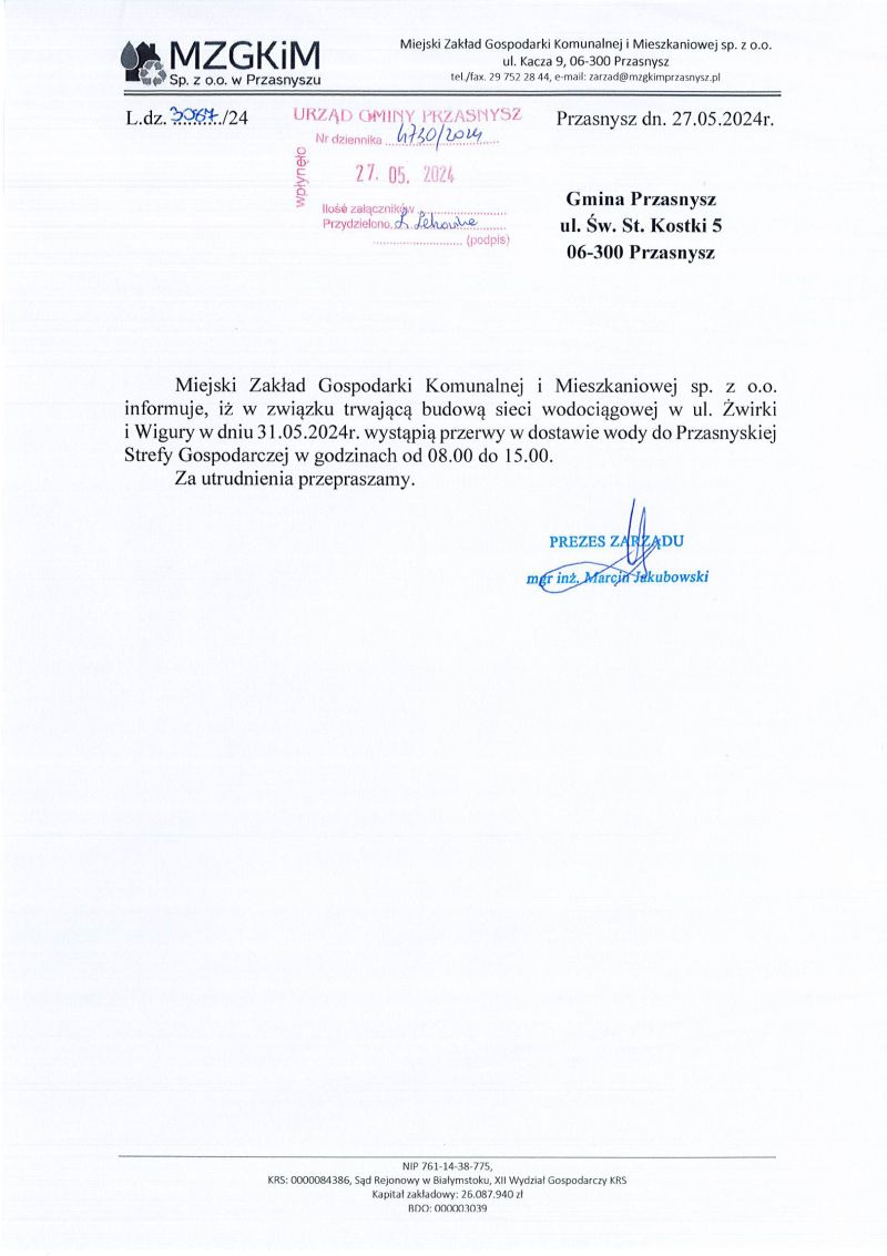 Miejski Zakład Gospodarki Komunalnej i Mieszkaniowej informuje, że w piątek 31 maja będą prowadzone prace budowlane sieci wodociągowej wzdłuż ulicy Żwirki i Wigury w Przasnyszu. W związku z tym w godzinach między 8.00 a 15.00 wystąpią przerwy w doprowadzaniu wody do budynków zlokalizowanych na terenie Przasnyskiej Strefy Gospodarczej w Sierakowie.