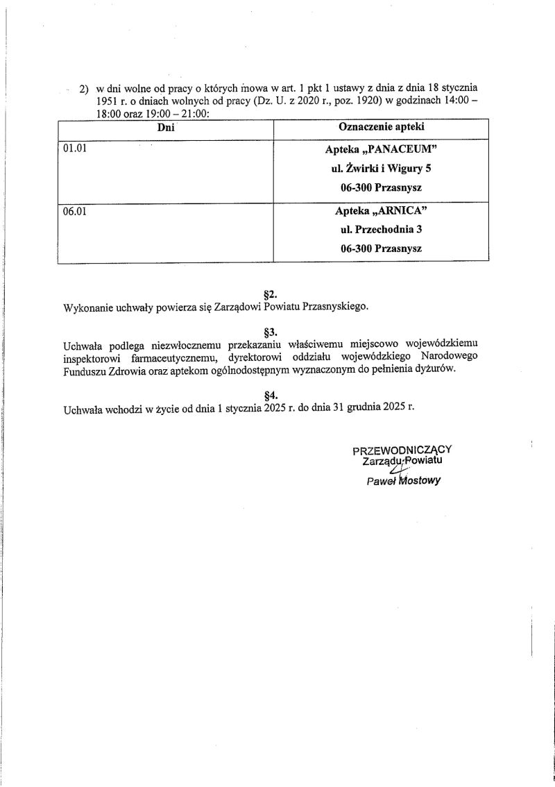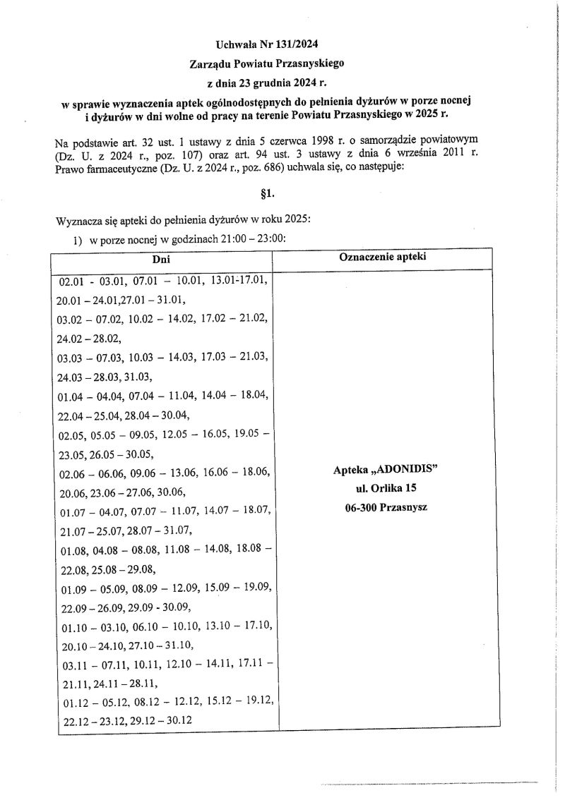Przedstawiamy poniżej uchwałę Zarządu Powiatu Przasnyskiego dotyczącą rozkładu godzin pracy aptek w powiecie przasnyskim w porze nocnej. Uchwała będzie obowiązywać przez cały rok 2025.