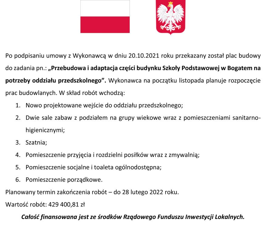 W ostatnich dniach października władze Gminy Przasnysz przekazały wykonawcy plac budowy wokół szkoły w Bogatem. Na początku listopada ruszą tu prace budowlane przy projekcie pn.: „Przebudowa i adaptacja części budynku Szkoły Podstawowej w Bogatem na potrzeby oddziału przedszkolnego”. To kolejna inwestycja realizowana przez naszą gminę z Rządowego Funduszu Inwestycji Lokalnych.