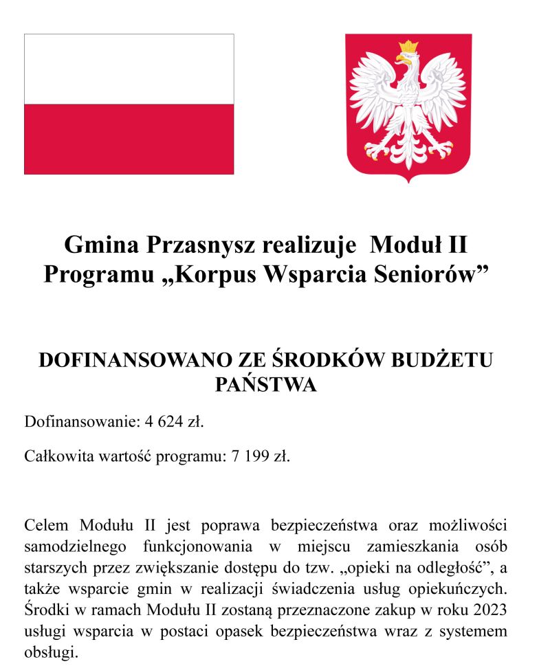 Gmina Przasnysz realizuje  Moduł II Programu „Korpus Wsparcia Seniorów”. Jego celem jest poprawa bezpieczeństwa oraz możliwości samodzielnego funkcjonowania w miejscu zamieszkania osób starszych przez zwiększanie dostępu do tzw. „opieki na odległość”, a także wsparcie gmin w realizacji świadczenia usług opiekuńczych.
