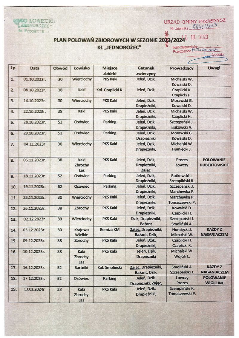 Wójt Gminy Przasnysz podaje do publicznej wiadomości informacje na temat planowanych polowań na terenie gminy organizowanych przez koła łowieckie JEDNOROŻEC oraz WKŁ nr 181 w sezonie 2023/2024.
