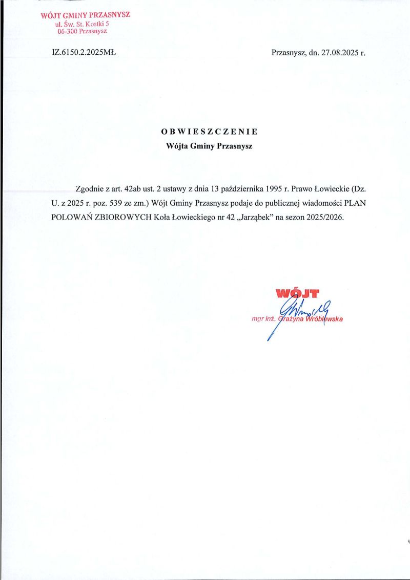 Prezentujemy w załączniku obwieszenie z planem polowań Koła Łowieckiego "Jarząbek", którego okręg łowiecki obejmuje teren gminy Przasnysz.